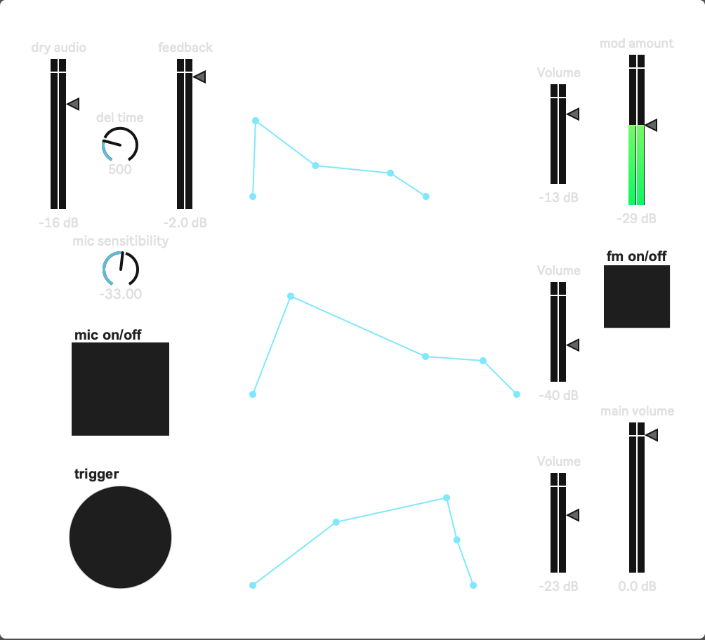 | Description: | A generative ambient device that can be triggered by audio. The incoming audio is also processed by the delay so you can add a layer with voice or anything. There are 3 (4 with the external one) sound sources, the first plays chords, the 2nd one is a detuned high pitched saw and the 3rd one a simple sinewave. You can set the envelope of each of these. A random fm modulator is also playing and can be turned on/off. |