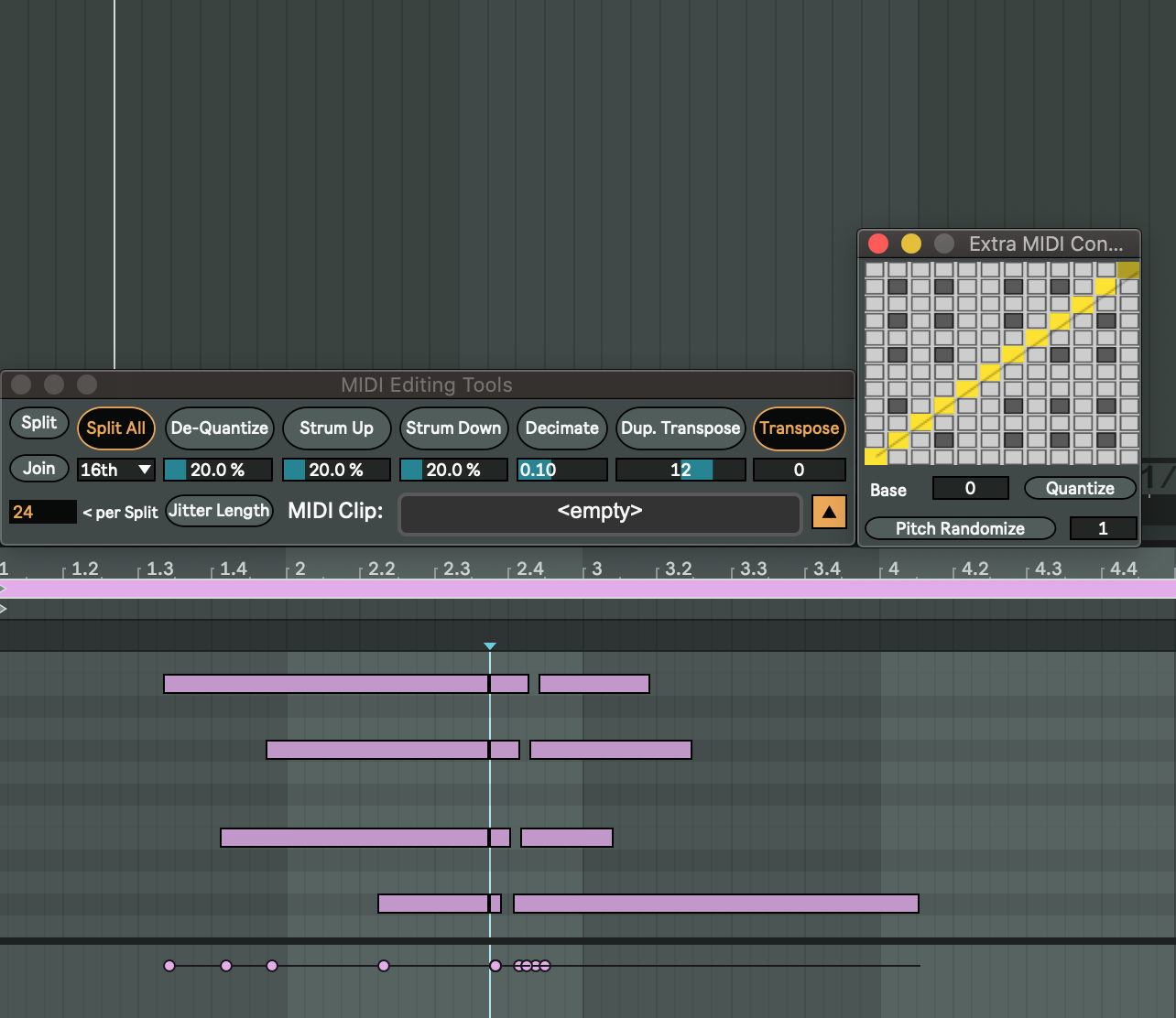 | Description: | Finally Ableton has good midi editing capabilities thanks to MZ MIDI Edit! Do things like split notes, join notes, de-quantize, strum and more! Most parameters are key mappable as well. New in v1.1: Jitter Length Video demo: https://youtu.be/8og-Rx8Uimo Some things to note: Ableton 11.0 and higher only Only works on arrangement clips (not session clips) Doesn't work when multiple clips are selected |