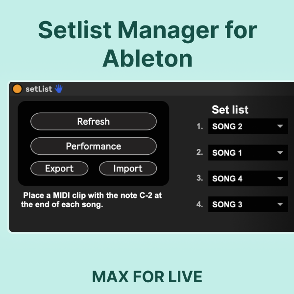 | Description: | Introducing LiveSet: The Ultimate Setlist Manager for Ableton Live DEMO VIDEO : https://youtu.be/yAOqcjBjo8Y Unlock the full potential of Ableton Live with LiveSet, a powerful Max for Live device designed to revolutionize your live performances. Seamlessly create, organize, and navigate setlists in Arrangement View, giving you complete control over your live shows. Key Features : 👉 Effortless Setlist Creation and Editing : With LiveSet, effortlessly create and modify setlists directly within Ableton Live's Arrangement View. Simply add cue points for each sound and arrange them from LiveSet. 👉 Automated playback control : Experience uninterrupted performances with LiveSet's intelligent playback control. As each track comes to an end, LiveSet automatically stops playback and moves on to the next track in your setlist. Concentrate on your performance while LiveSet handles the transitions for you. 👉 Setlist Recording and recall : Capture your meticulously crafted setlists with LiveSet's convenient recording feature. Save and store your setlists for future performances or reference. Whether you're refining your live show or exploring new creative possibilities, LiveSet allows you to effortlessly record and reimport your setlists, ensuring consistent and seamless performances every time. 👉 Performance View : LiveSet's Performance View provides an intuitive interface for keeping track of your live performance progress. Easily visualize the current playing track and the upcoming track, ensuring a smooth and error-free performance. Take full control from this interface by starting, stopping, and navigating between previous and next tracks effortlessly. LiveSet empowers you to focus on your creative expression, giving you the freedom to immerse yourself in the music. Elevate your live performances, captivate your audience, and seamlessly navigate through your setlist with LiveSet. Release notes: Version 1.1: - The device now retains the last settings when closing and reopening the Ableton session. - Add a button to move the playback head to the beginning of the setlist. |