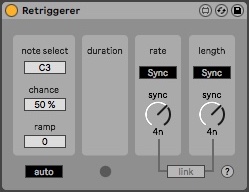 | Description: | Retriggerer is a modified M4L.md.12.TimeSync midi echo to make it behave like the retrig function of a Digitakt or a midi version of the Beat Repeat device. Place it on a drum rack pad to instantly add rachet to your hihats or place several on a synth lead/bass to add variation. It is only set to work on one note at a time. Set chance to determine how likely the effect is to activate per note-on message the device receives. Set ramp to add a positive or negative velocity in to a feedback loop which will ramp the velocity up or down during the ratchet. Duration is set to auto by default which follows the duration of the incoming midi notes. Set it to manual to extend or shorten the duration using sync or time values. Rate of retrigger and length of retriggered notes can be set using sync or time values and by activating link, both rate and length dials move together. The led under duration indicates both that the effect is active and the duration of the effect. |