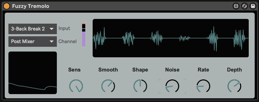 | Description: | Fuzzy Tremolo takes a sidechain signal input and manipulates the depth and rate depending on the strength of the sidechain signal. Control the smoothness of the sidechained input, the shape of the tremolo waveform (sine to square) as well as a pink noise generator which adds an extra dash of fuzzyness to the effect. Try running a vocal through it while sidechaining with a sub-bass and a fast rate! |