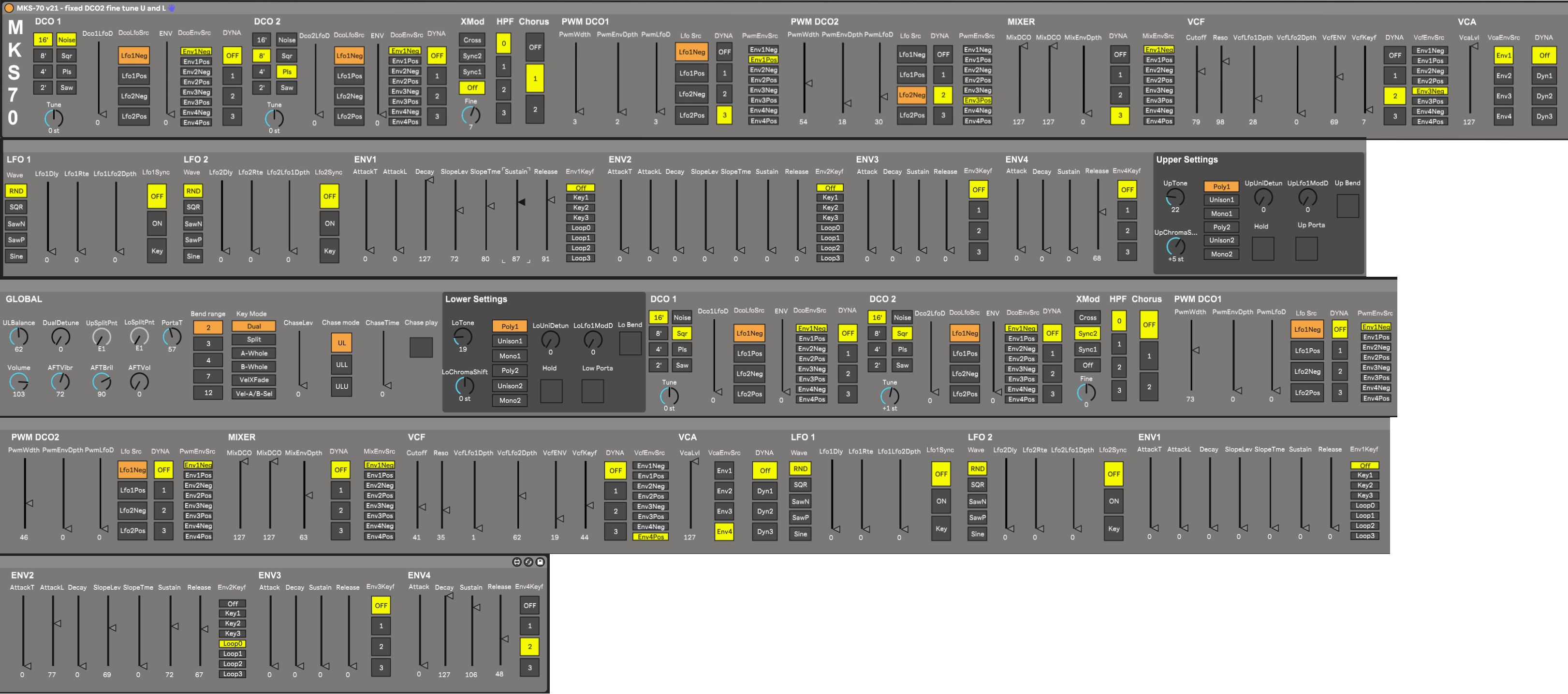 | Description: | A Max for Live device for the Roland MKS-70 and JX-10 with Vecoven mod Prerequisites: 1. MKS-70 or JX10 2. Vecoven Mod v4.x (3.x will not work) 3. PWM daughter board 4. Ableton Live Suite 11 (the only one tested, MIGHT work with Live 10) With this m4l device you can control and edit all (!) parameters of the Roland MKS-70 and JX10 from Ableton Live. This is done separately for UPPER and LOWER, that's why the device is soooo wide, there's shitloads of parameters, apologies. I might at some point do a popup version, but would need to learn this first 😇. The device is currently unidirectional, which means 2 things: 1. The values of the controls will not have a correct representation of the actual values on the synth, UNLESS you change each parameter one on the m4l device. 2. Values will jump to the value you'll click. There's no patch/preset storage on the device (yet). So if you change something and like it, store it ON the MKS70/JX10 itself. This is currently the first public release (internal version 21), so there might be bugs! If you find one, please tell me! (open an "Issue" on GitHub). Future plans: 1. make it birectional with patch parsing, so that the shown values represent the actual values. 2. make it prettier and maybe do a popup version |