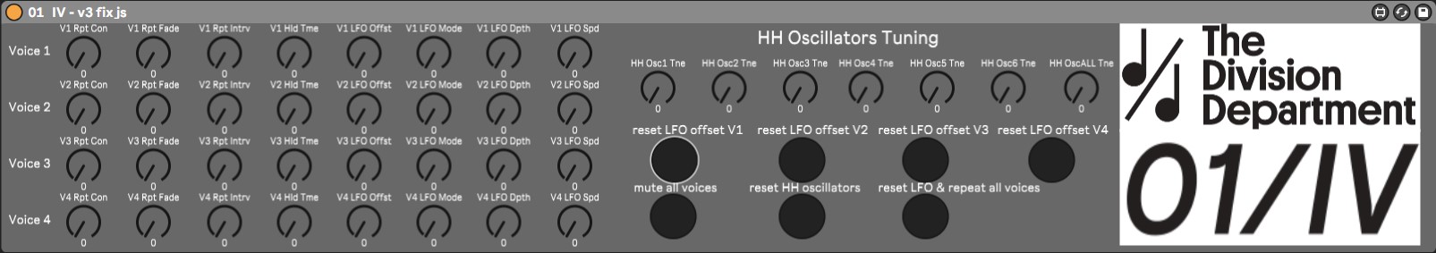 | Description: | A Max for Live device for the drum synth "01/IV" from The Division Department This maxforlive device can control all the CC parameters for the 01/IV plus the reset features that are available via notes. Now you can access, edit and automate all the hidden functionality that is not available via knobs. No patch storage, not (yet) pretty ;-) Logo only used, so that you can identify the device |