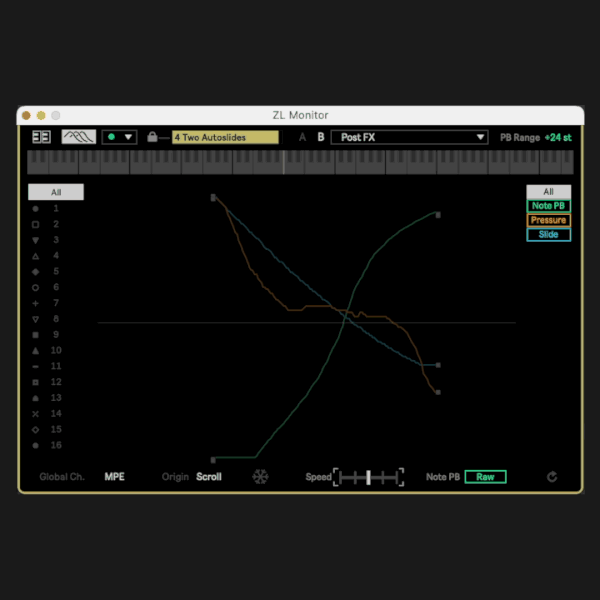 | Description: | ZL Monitor is the first graphical MPE Monitor in Max for Live. It's a convenient and intuitive way to get insight into MIDI Polyphonic Expression in your tracks. ------------------ FEATURES ------------------ * Graph MPE Pressure, Slide, Note PB (and any other Multi-Channel MIDI) for up to 15 voices at once. * Easily A | B compare MIDI from two points in the MIDI signal chain. * "Notes" view shows notes simultaneously from A and B routings. * Display Pitch of input note combined with Note PB. * "Origin" graph mode allows comparison of different MPE curves from notes which start at different times. * One instance per set, instead of bunches of MIDI Monitor devices. * Resizable window. * Minimal CPU usage for drawing. ------------------ REQUIREMENTS ------------------ * Live 11+ * Max for Live |