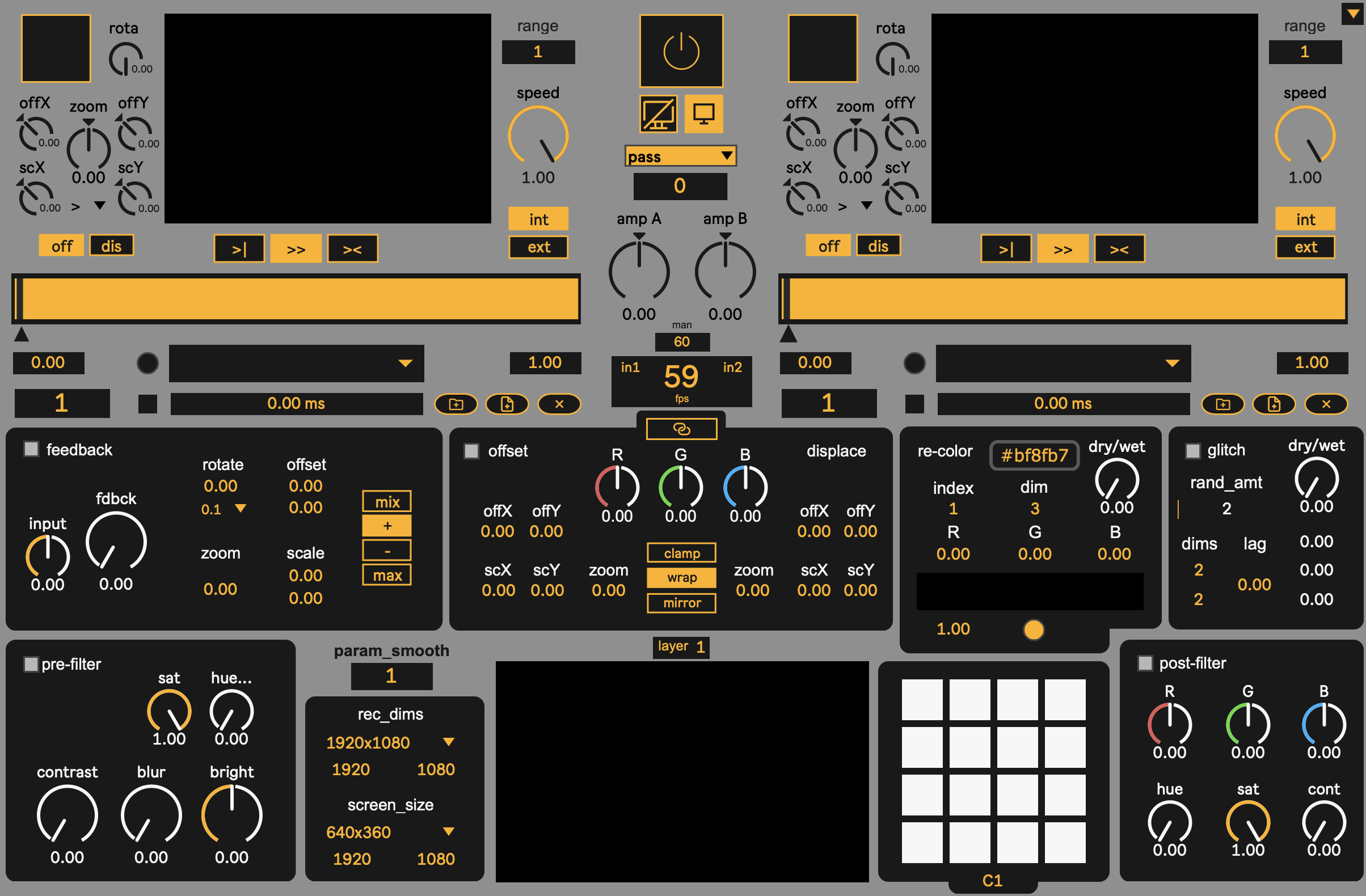 | Description: | A versatile video synthesizer with many of the essential video manipulation methods with some unorthodox twists. It comes with two polyphonic video players that can be mixed many ways and also cross modulated by one image displacing the other. Effect section: 1. Pre Filter: contrast, brightness, saturation and hue with a blur parameter included. 2. Feedback: A powerful video feedback module with many functions 3. RGB Displacement: Offset or displace the image on the red, green or blue color planes individually and proportionally. 4. Re-color: Generate custom color sets that can be used to completely redefine the colors of the image. 5. Glitch: Create random glitching on the image. 6. Post Filter: Similar to the Pre Filter module, but with a color EQ for subtle color adjustments. Preset Section: Save the current state of the device and recall it with a click of a button or by MIDI notes. Syphon/Spout integration: Send your image into other Syphon/Spout enabled devices to record/stream/further modulate it with other softwares, like OBS, Resolume, After Effects and more. For more info check out our website: https://synthropia.xyz/ You'll find tutorials about all features on our Youtube: www.youtube.com/@Synthropia And more example videos on Instagram: https://www.instagram.com/synthropia/ |