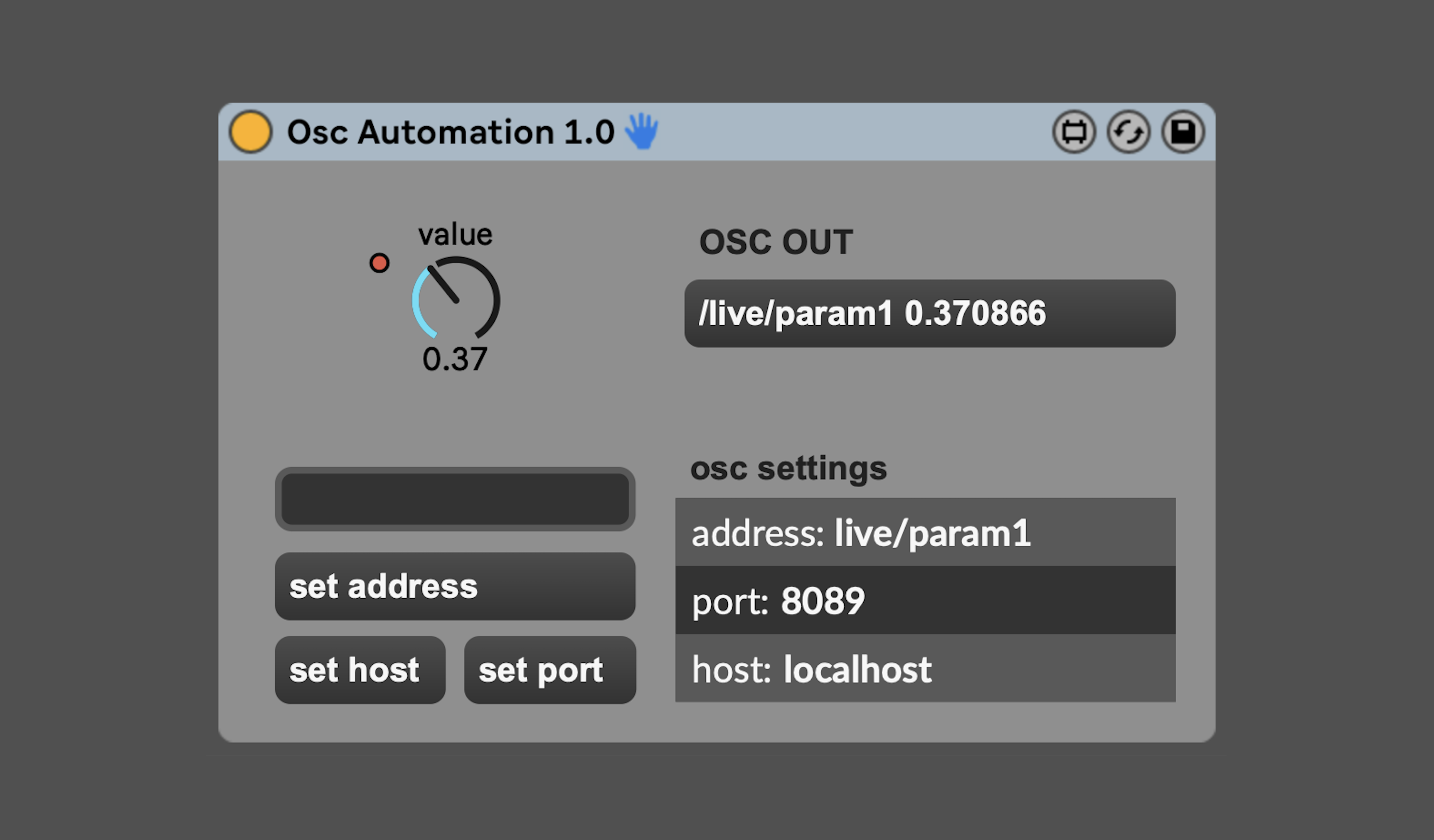| Description: | Multiple free and simple OSC senders is for automating OSC values in Ableton Live. The multiple versions of this max patch have different ranges and value types. versions: 1.0 is a 0. to 1. float value -1.0 is a -1. to 1. float value 24 is a 0 to 24 integer value They can also double as a Midi to OSC converters by Midi mapping the automatable parameters. |