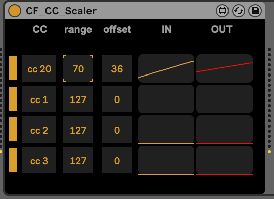 | Description: | CC Scaler lets you scale the output of 4 different CCs. Default setting doesn't change anything but you can reduce the range and also offset it by adding or subtracting a value to the result. So you can keep an automation going, preserve its curve but change its intensity and and starting point. If your into modular, think of it as an Attenuator + Offset combo for modulation in the analog domain. 1.1 Update : Added scopes Added disable control 1.2 Update : Removed CC0 (seen as aftrertouch) Renamed Parameters Default is now disabled |